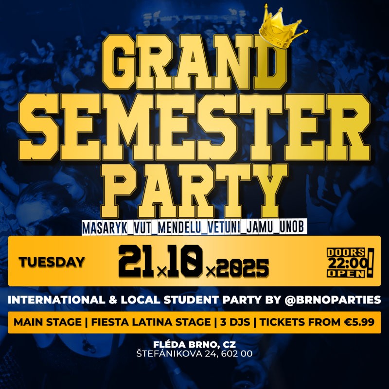 HOW ABOUT ONE HUGE PARTY BEFORE THE HALLOWEEN??! GRAND SEMESTER 👑🎓IS BACK ON TUESDAY IN FLÉDA! 🔥WE’RE CALLING IN ALL THE ATTENDEES FROM ERASMUS WELCOME FESTIVAL 🛬, GRAND SEMESTER OPENING 👑, MASARYK STUDENT PARTY 💙🎓AND FIESTAS LATINAS💃🏻!